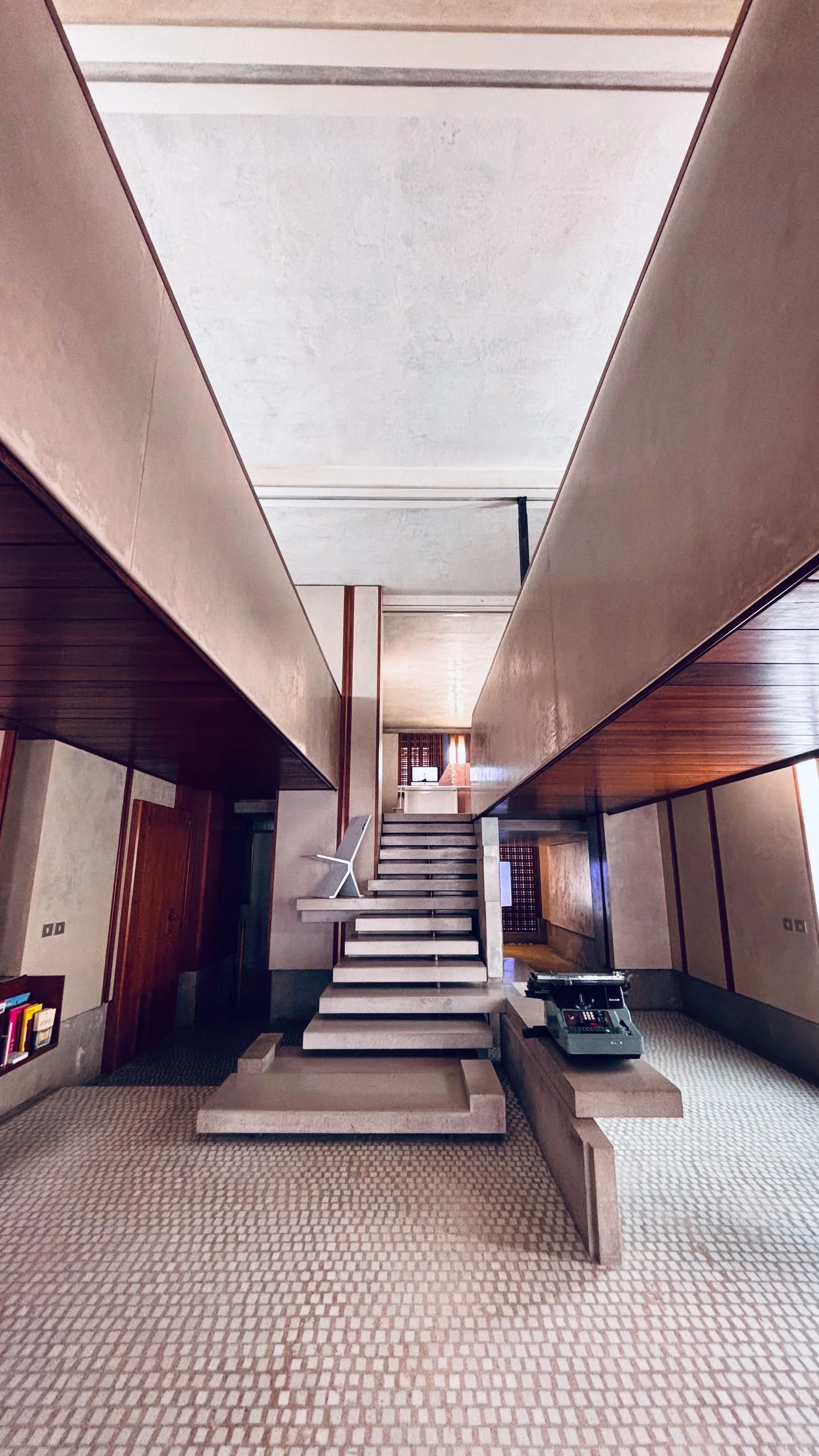 Scarpa non ha costruito solo un luogo dove esporre macchine da scrivere e calcolatrici: ha trasformato uno spazio stretto e buio in un palcoscenico luminoso. Pensaci: una scala in marmo d’Aurisina che sembra sospesa nel vuoto, mezzanini in teak africano, vetri bisellati, ottone che riflette la luce come fossero piccole stelle. È come se ogni dettaglio fosse un verso di una poesia visiva.